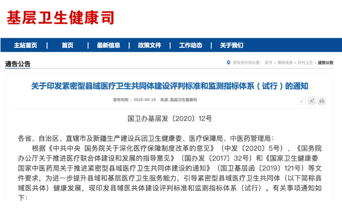 9月18日,國家衛(wèi)健委基層衛(wèi)生健康司發(fā)布《關(guān)于印發(fā)緊密型縣域醫(yī)療衛(wèi)生共同體建設(shè)評判標(biāo)準(zhǔn)和監(jiān)測指標(biāo)體系(試行)的通知》(以下稱《通知》),指出將進(jìn)一步提升縣域和基層醫(yī)療衛(wèi)生服務(wù)能力,引導(dǎo)緊密型縣域醫(yī)療衛(wèi)生共同體(以下簡稱縣域醫(yī)共體)健康發(fā)展。